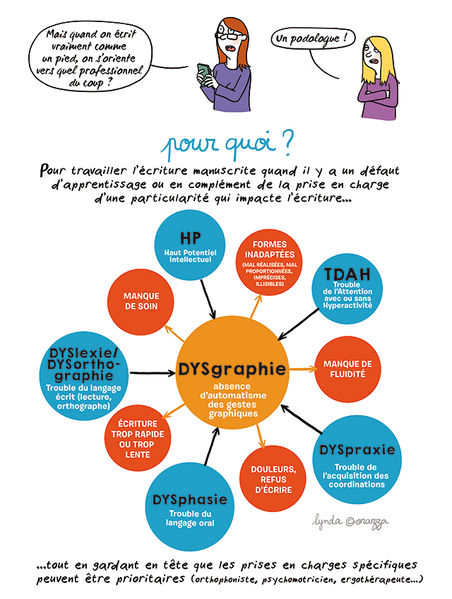 - Le graphothérapeute intervient lorsque l'écriture est douloureuse, illisible et/ou lente. Il rééduque la posture et le geste du patient, de manière ludique et multisensorielle.